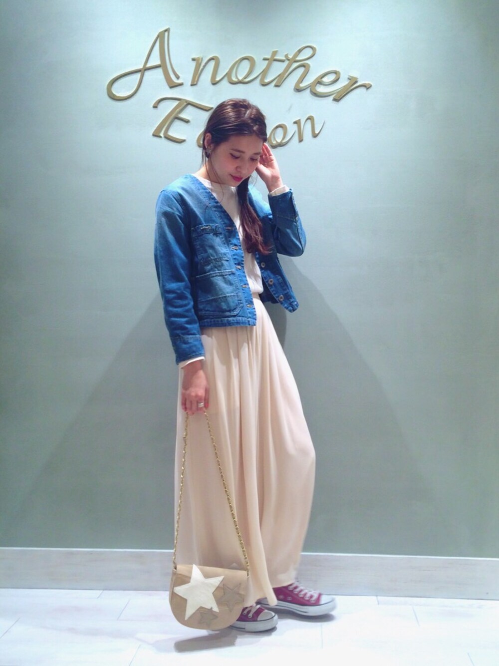 eeen52のデニムジャケット「■デニムノーカラーカバーオール/AEBC DNM NO/COL COVERALL◆」を使ったコーディネート