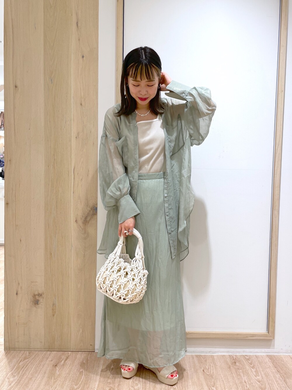 こんにちは!いつも、 いいねお気に入りありがとうございます◎ 今期トレンドのシアーシャツは、 セットアップで着ても可愛いですよー! グリーンカラーは、顔うつりも明るい印象に してくれるのでおすすめです!