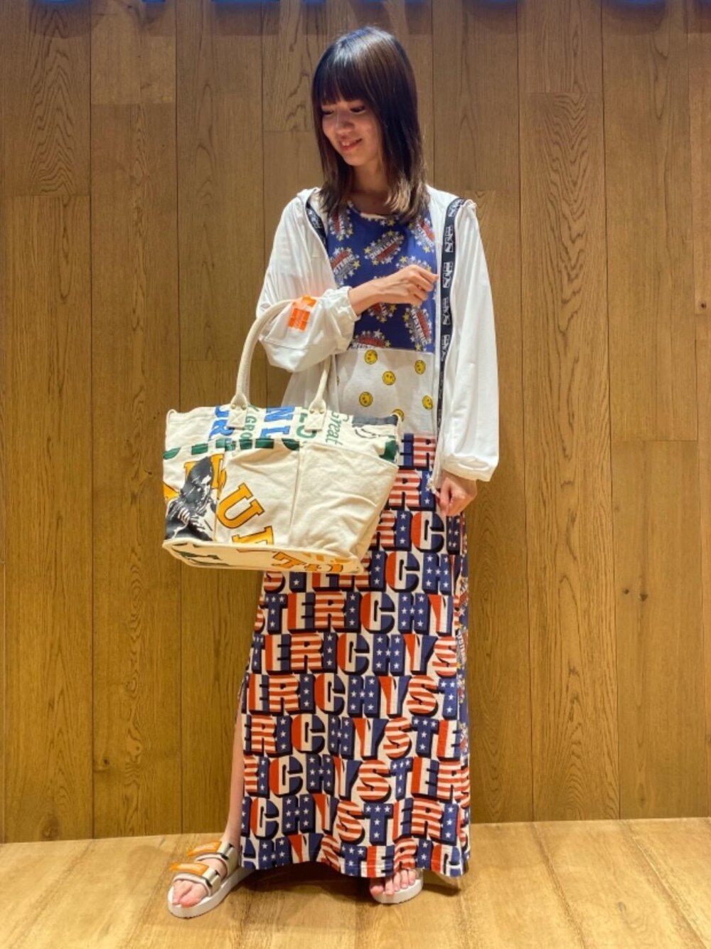 新作の大胆なプリントが可愛いキャンバスバッグ💕プリントが可愛い上に、ポケットも豊富で収納性も兼ね備えて居るので、普段使いにとてもおすすめ✨✨ 総柄のワンピースにパーカー羽織ってピクニックコーデ🎀🎀