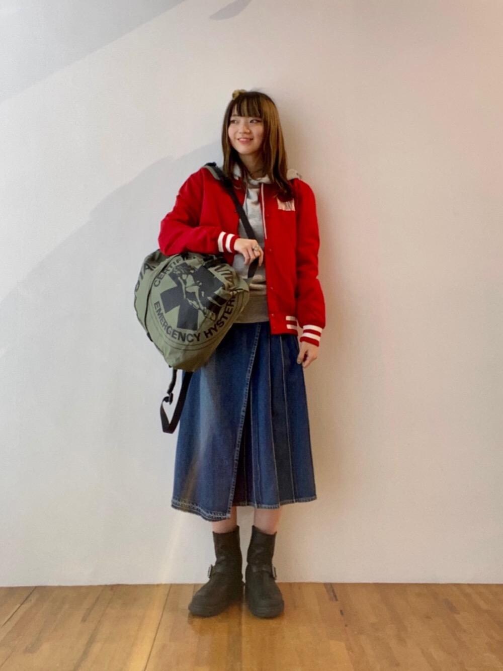 スタジャン:S パーカー:S スカート:M 赤のスタジャンは春先も使えて、コーデの差し色にもなるのでめちゃくちゃ使えるアイテム👍