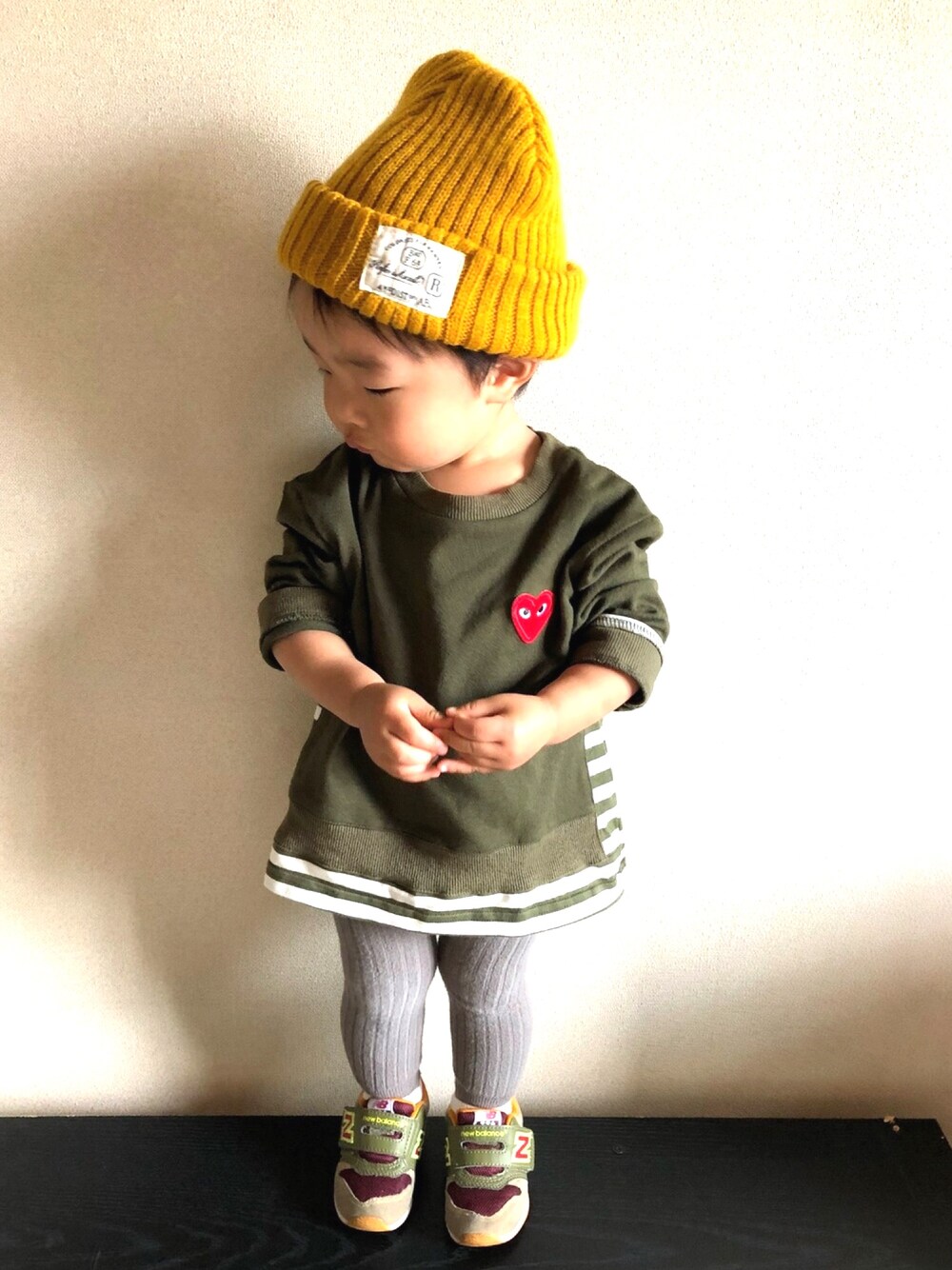 トップス100cmだけどちょっとゆったりめに着れて可愛い❤️💚 流行りのリブレギンスもめっちゃよく伸びる👏 色違いリピしようかな😍🤲 ちょープチプラコーデ🙌💰 ベレー帽ver.も撮ったけど、どっちのが良いかな〜??🙈