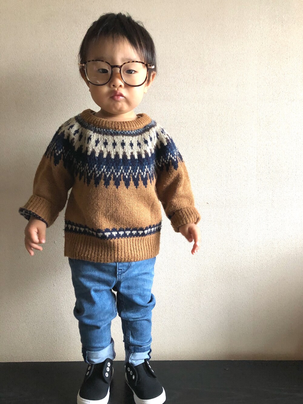 プティマインのノルディック柄セーター❤️ かわいすぎ〜🙈💓 でもなんかチクチクしそうな感じ💦 肌弱いうちの子には長袖インナー必須かも💡 H&Mのデニムの形すんごい可愛いから好き👏 ちなみにこれはストレッチ無しタイプ👖✨ でもあんまり動きづらそうな感じはしなかった🙆♀️
