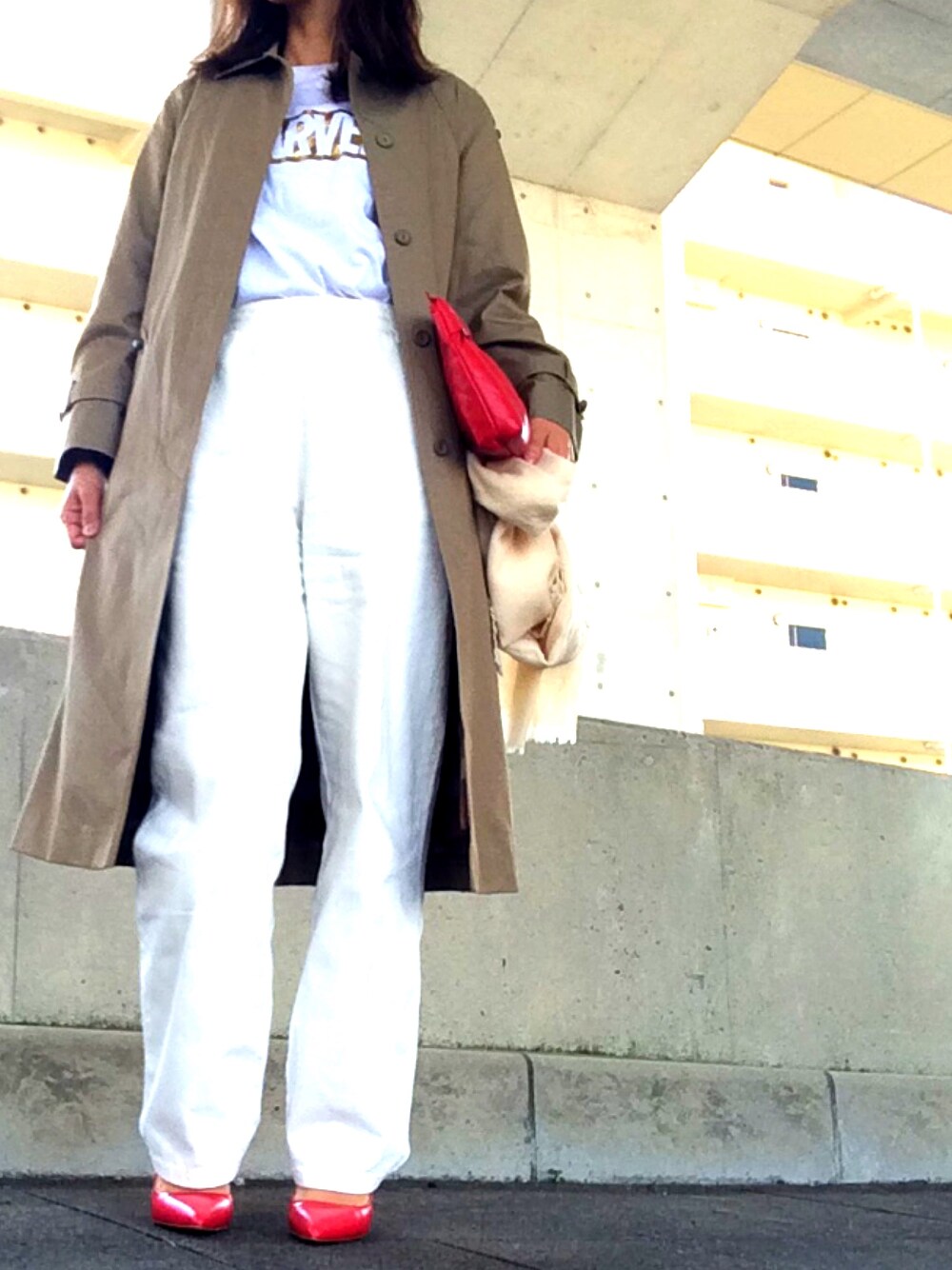 オールホワイト+トレンチ⭐️ またまた赤のクラッチと ZARAのパンプス 笑 こればっかしー でもヒール高いのに1回も靴ズレしなぃ! GUのT-shirtはメンズが好き❤︎ 春ですね〜 🌸 ストールしてたら暑くてはずしました(^^;;