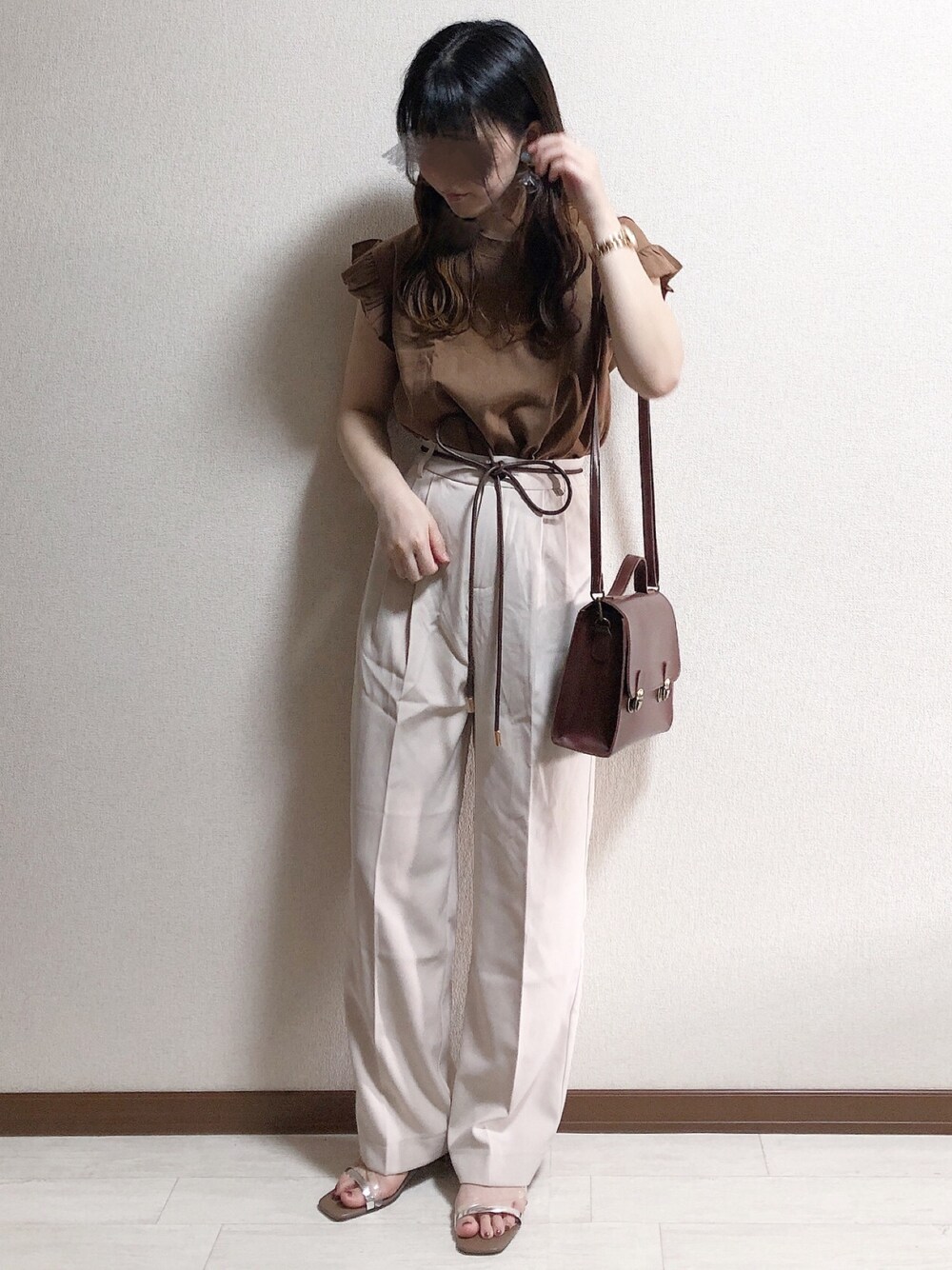 ブラウンのトップスに白ボトムスで爽やかコーデ!