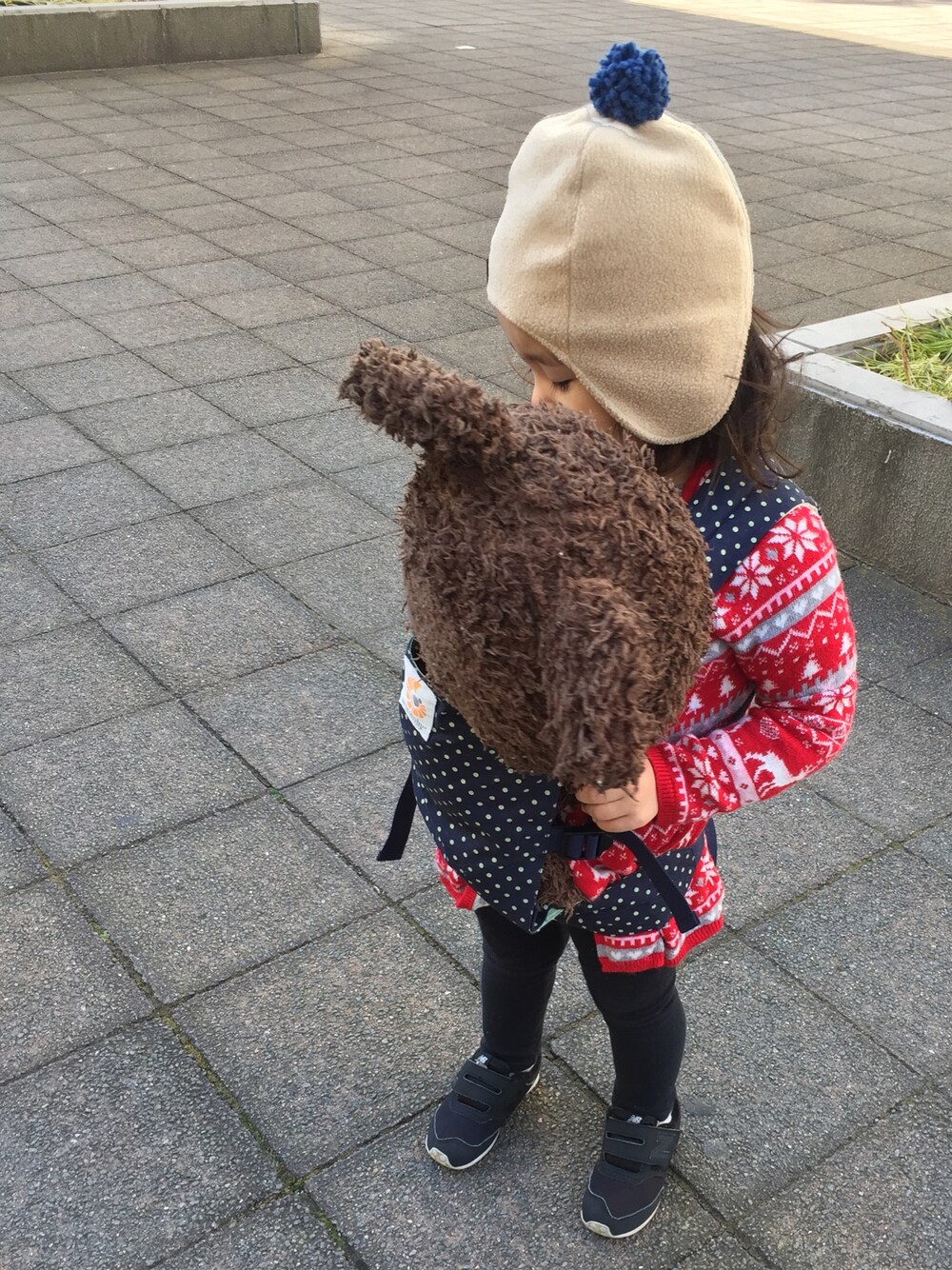 帽子はもう小さい。ジャッキー抱っこ紐で抱えてお出掛け。
