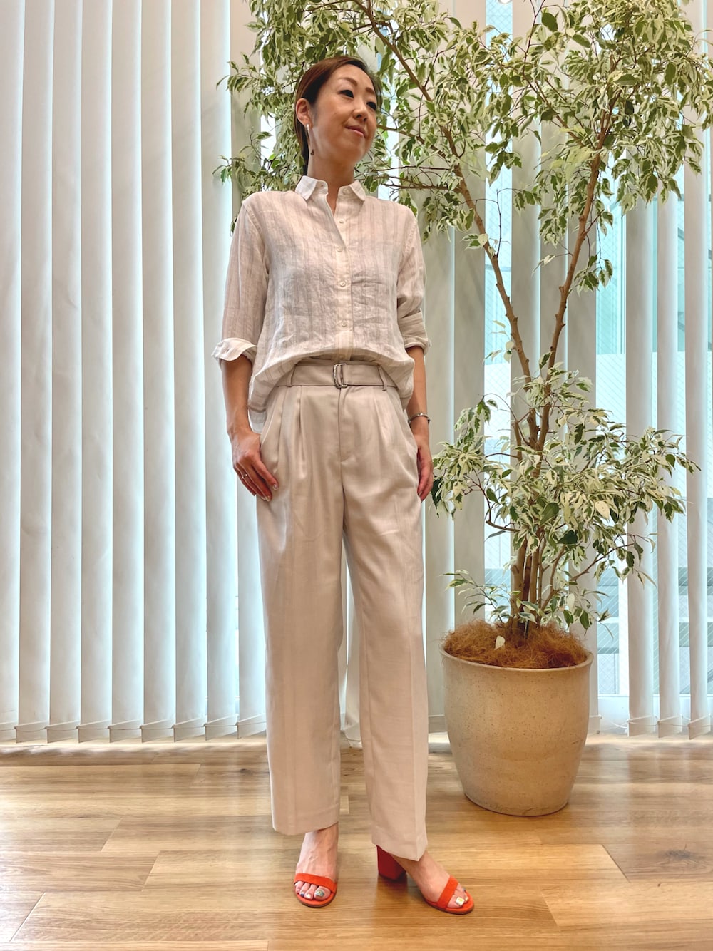 これからの季節に日焼け防止にも活躍するリネンブラウス。パンツにインしてカチッと合わせたり、ワンピースにサラッと羽織りカジュアルに合わせても、スタイリングが決まります。カラー別で何枚も欲しくなる一枚です。 ブラウス9号サイズ パンツ7号サイズ