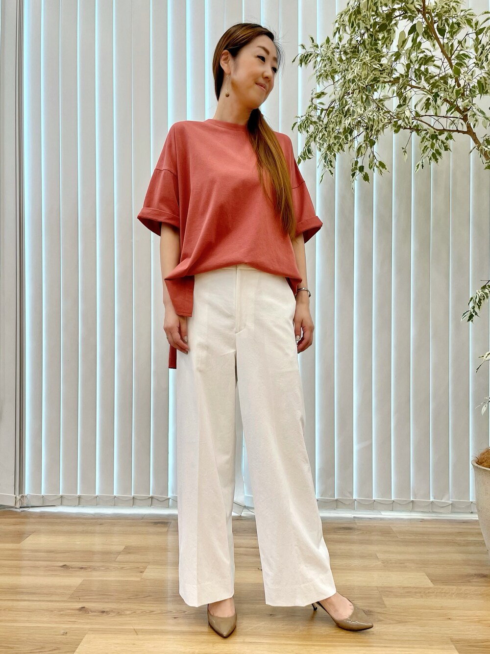 サイドスリットで、はり感があるジャージー素材のビックTシャツ。インしてもアウトにしても スタイリングが決まります。ワイドパンツに合わせてサラッと大人カジュアルに。上下とも洗える素材なのでこれからの季節におすすめです。 上下とも9号サイズ着用。