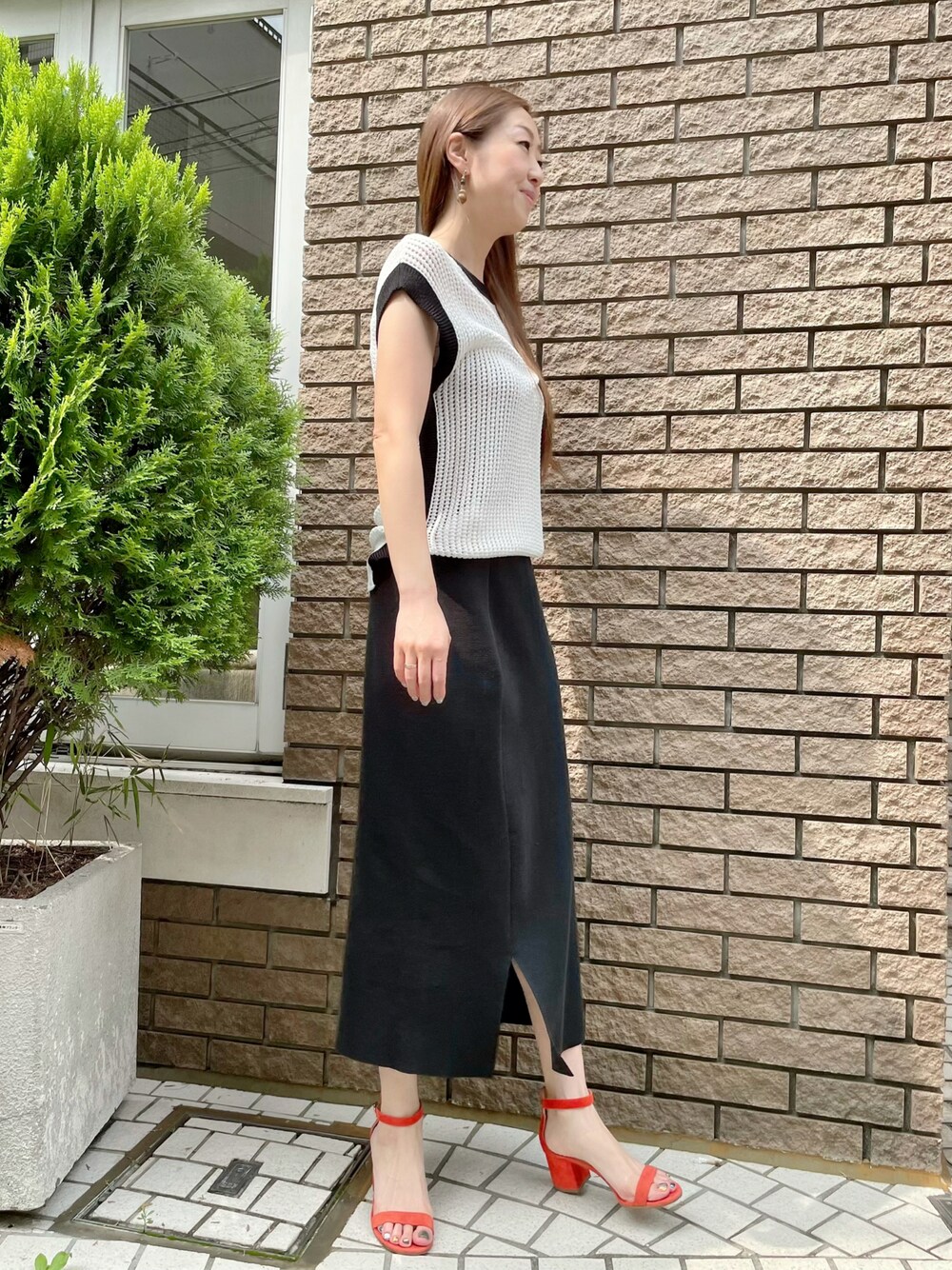 透け感があるサマーニットをニットスカートに合わせて大人女子コーディネート。モノトーンですが、足元をオレンジのなどのカラーサンダルにすると華やかな印象になりますよ。 上下ともに9号サイズ着用。