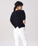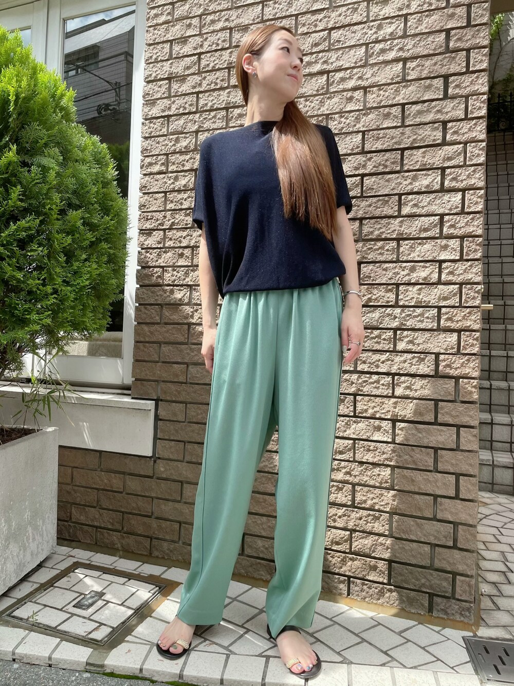 バックスタイルも素敵なラメ入りサマーニット。ゆるっとしたワイドパンツに合わせてリラックスコーディネート。ネイビーとグリーンの相性抜群に可愛い大人カジュアルに仕上げました。 上下とも9号サイズ着用。