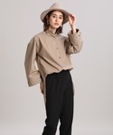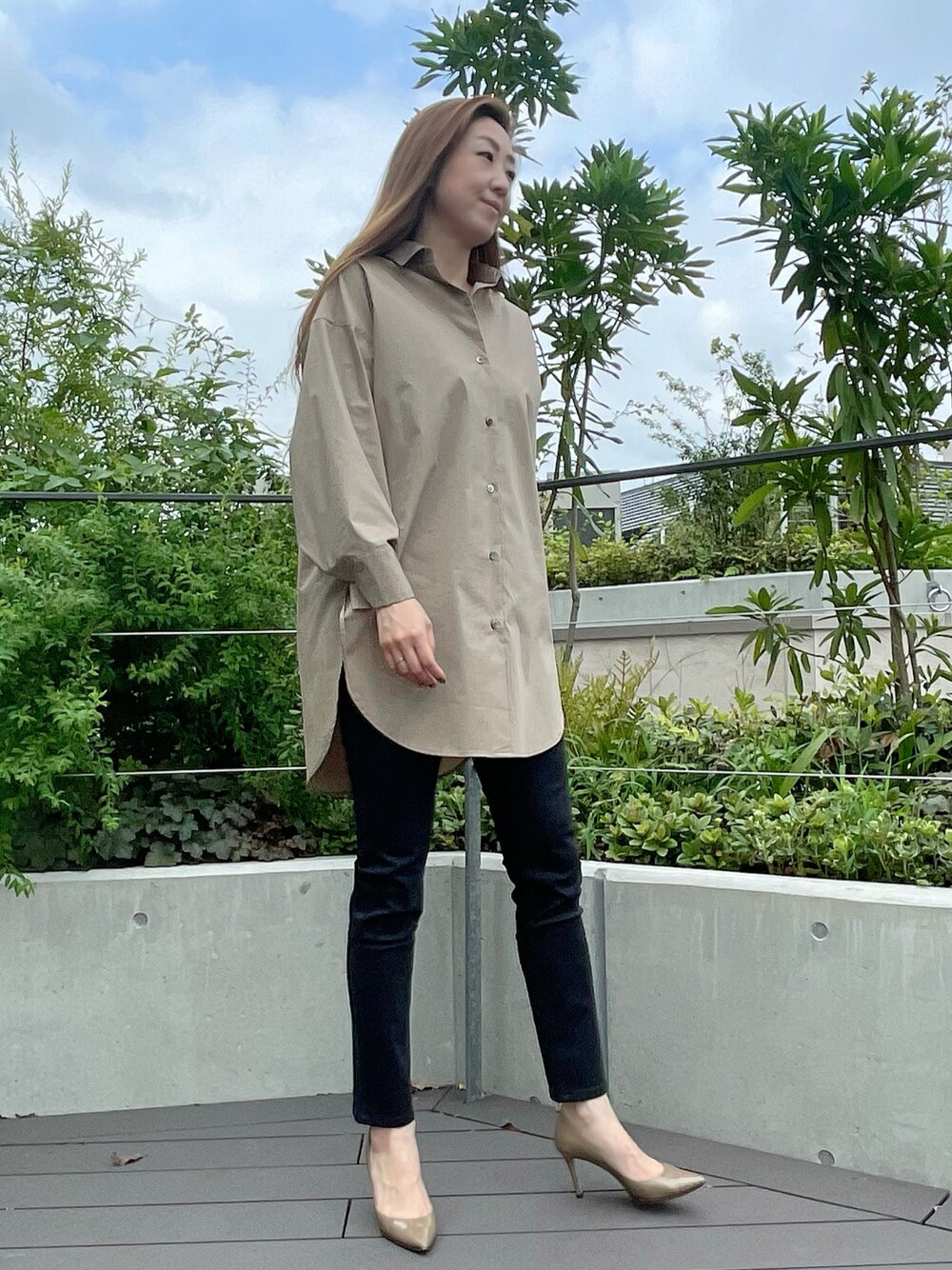ヒップまで、まるまる隠れるワイドシルエットシャツ。ボタンの留め方で袖のボリューム感を遊べます。その時に、合わせるボトムスで印象を変えてみるのも楽しいですよ。今回は、スキニーパンツにしたので、スッキリした印象に仕上げる為に1番奥のボタンを留めてます。 上下ともに9号サイズ着用です。