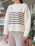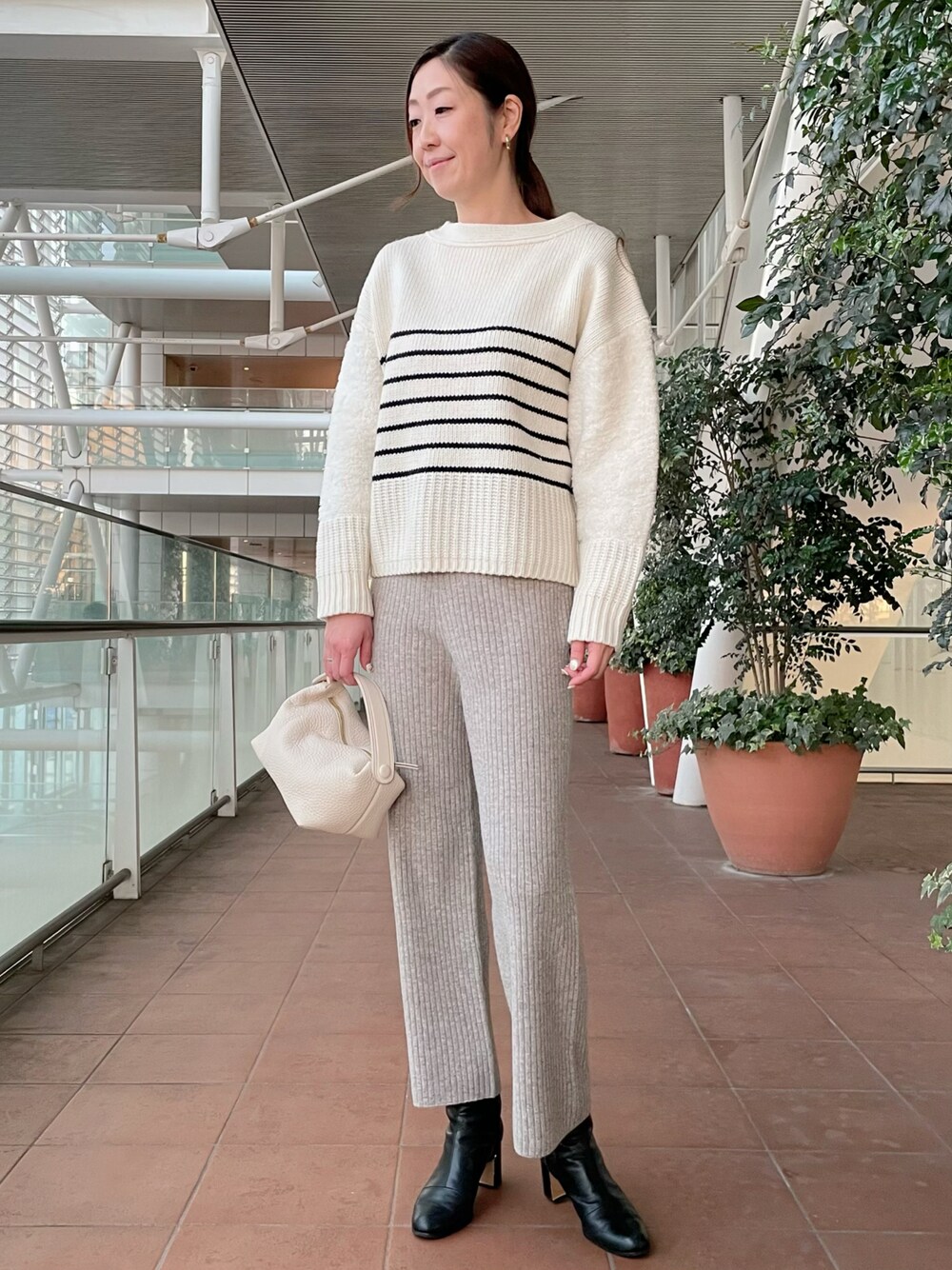 お袖の部分を異素材で組み合わせたドッキングニット。リブニットパンツがボーダーニットとの相性抜群です。お家時間はもちろんのこと、リラックスしてお洒落を楽しめるコーディネートになっています。 上下ともに9号サイズ着用です。