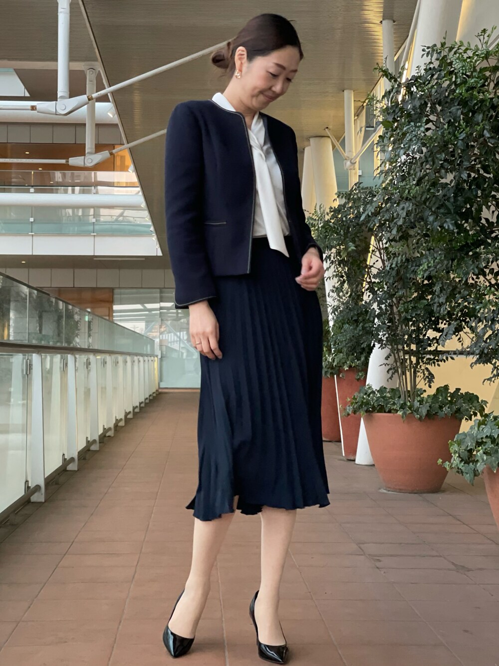 シンプルなノーカラーツイードジャケット。ラメ糸などを使っていないので、よりクラシカルな印象に仕上がっています。プリーツスカートはもちろんですが、パンツにも合わせていただける着丈になっています。セレモニーやオフィスなど様々なシーンでご利用いただけますよ。 全て9号サイズ着用です。