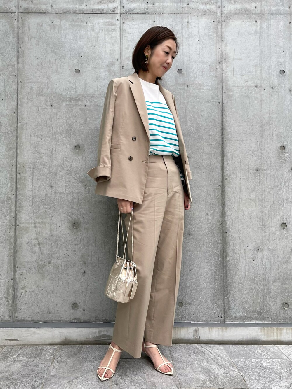 サラッとした素材で夏まで使用していただけるセットアップ。ボーダー柄カットソーをインナーに合わせてキレイめカジュアルに。上下別々でもスタイリングを楽しめるので重宝します。 全て9号サイズ着用です。