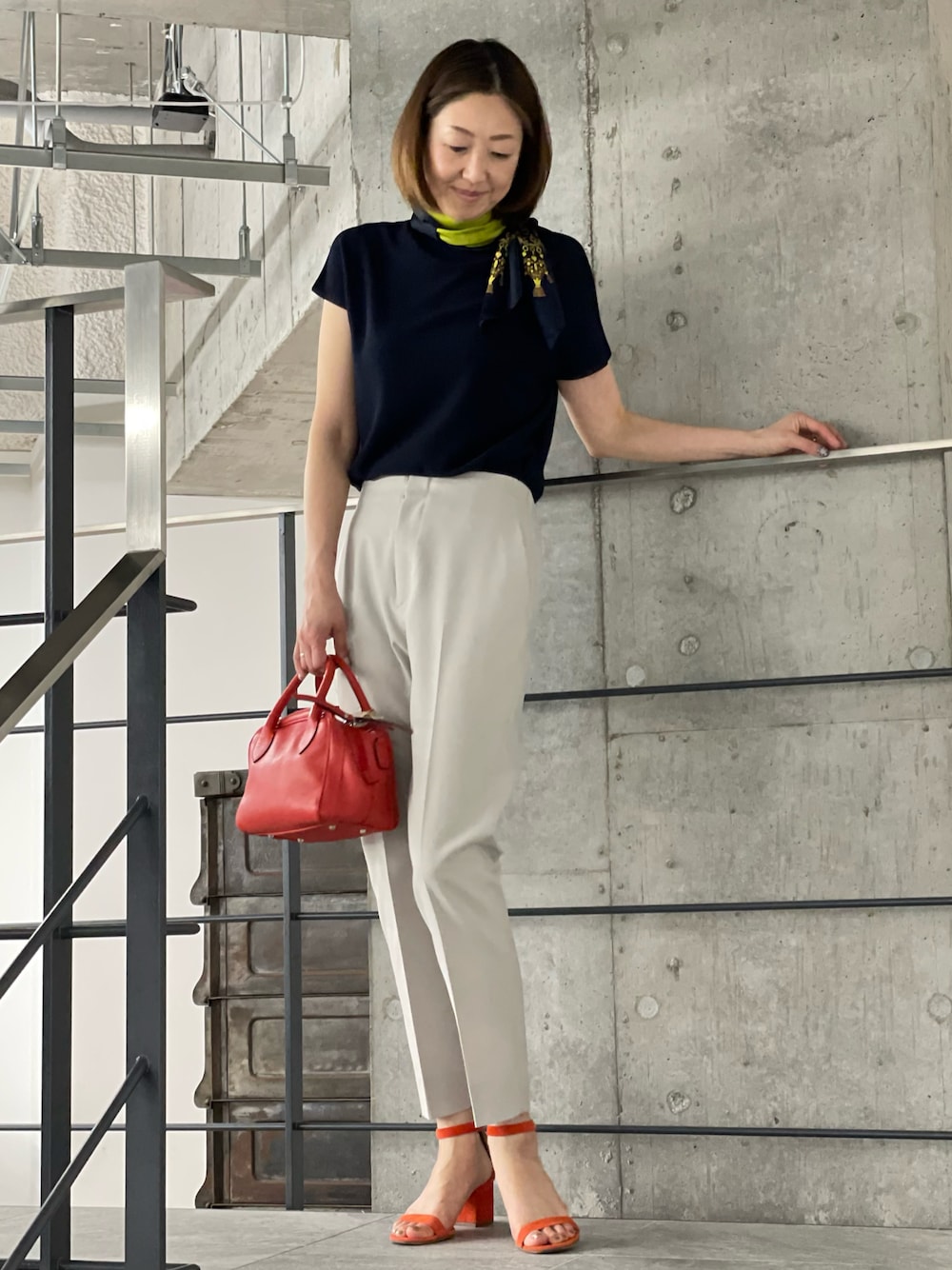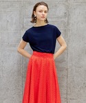 キュプラ混のフレンチスリーブニット。ドライタッチな肌触りで着心地抜群です。二の腕をさりげなくカバーしてくれるので、安心して着られます。テーパードパンツにニットをインし、スカーフでアクセントをつけて、キリッとお仕事モードスタイリング。汗ばむ真夏も洗えるので大活躍しますよ。 上下ともに9号サイズ着用。