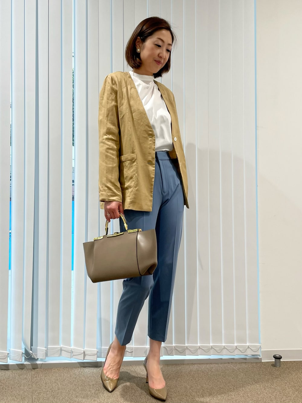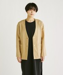 リネン素材を使用した通気性のよいジャケット。薄手で軽く、サラッと羽織れます。カラーパンツと相性が良く、色合わせに悩む事がないですよ。白ブラウスで清涼感アップコーディネートでオフィススタイリングに。 ジャケットはフリーサイズ、ブラウス、パンツは9号サイズ着用です。