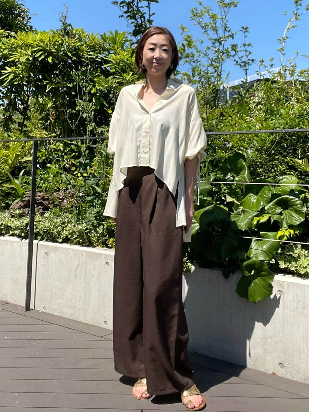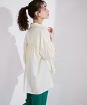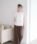 【着用サイズ】ブラウス:フリー パンツ:フリー コーディネートテーマは、ゆるっとラフなワンマイルスタイルです。柔らかな素材のリボンスリーブブラウス。前後差を大きくし抜き襟でサラッと着こなすのがPOINT。シアー感があるため、ワイドパンツでゆるコーデをしてもボリュームがですぎないのでおすすめです。これからの暑い夏も涼しく着ていただけそうです。