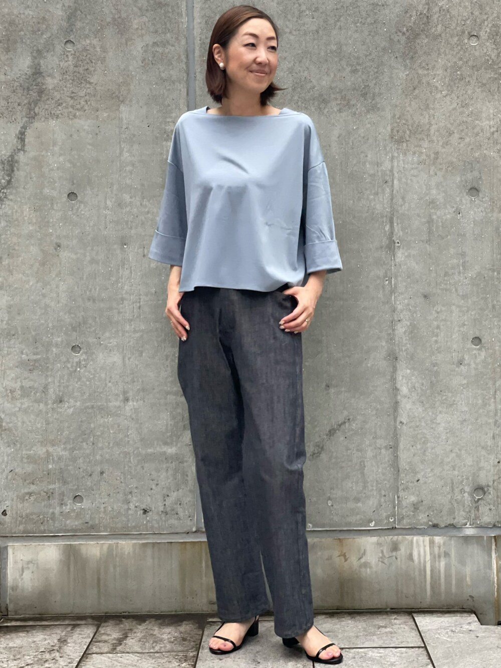【着用サイズ】カット:フリー パンツ:9号 コーディネートテーマは、デニム大人スタイリング。サラッとしていて穿き心地が抜群のストレートデニム。ハイウエストなので、気になるお腹周りを包み込んでくれてスッキリみえますよ。タックインいらずのベスト着丈カットソーと合わせるとスタイルアップで足長効果に。ブルーグレー×デニムの相性は抜群です。