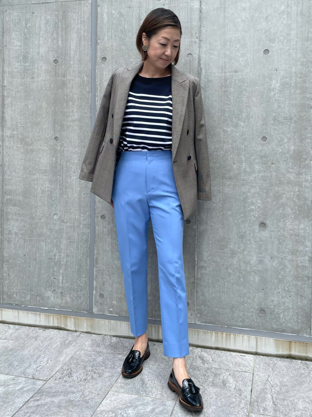 【着用サイズ】ジャケット:9号 カットソー:7号 パンツ:9号 オフィスカジュアルスタイル。チェック柄ダブルジャケットとボーダーカットソーの組み合わせは、グッとこなれたムードに。カラーパンツとの相性も抜群なのでお洒落を楽しみたい方にオススメです!これからの季節に様々なシーンのライトアウターとしても大活躍します。