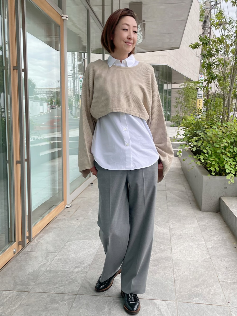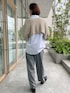 【着用サイズ】ニット:9号 ブラウス:9号 パンツ:9号 綺麗めカジュアルスタイル。全然違う印象になる2wayニット。白シャツとセミワイドパンツで合わせるとカジュアルになりすぎず、綺麗めに整いますよ。シーンに合わせて着回しを楽しんでください!