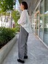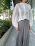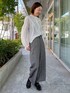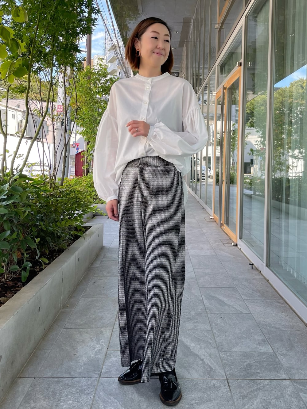 【着用サイズ】ブラウス:9号 パンツ:9号 通勤コーディネート。デコルテラインがスッキリ見えるギャザーブラウス。ボリューム袖がアクセントになりスタイリッシュに決まります。凹凸感のあるチェックパンツにも相性抜群。