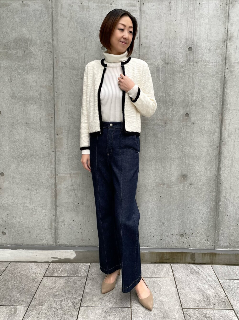 【着用サイズ】カーディガン 9号 タートル :9号 キレイめスタイリング。カジュアルになってしまいがちなデニムに、サラッと羽織れるジャケット風カーディガンでキレイめに。定番タートルニットを合わせて女性らしさもプラスしました!