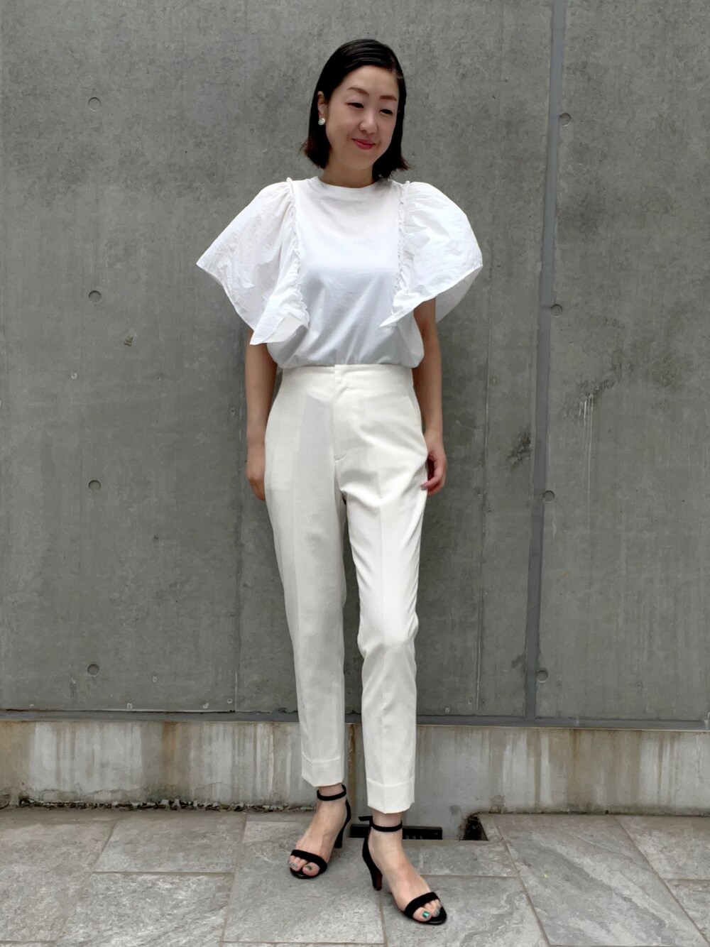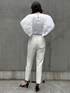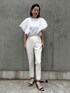【着用サイズ】カットソー:9号 パンツ:7号 【着用カラー】カットソー:オフホワイト パンツ:オフホワイト 夏のホワイトスタイリング。バタフライスリーブの部分が異素材になっているカットソーは、1枚で着ても様になるアイテムです。美脚パンツと合わせて清涼感漂うホワイトワントーンコーデにしました。