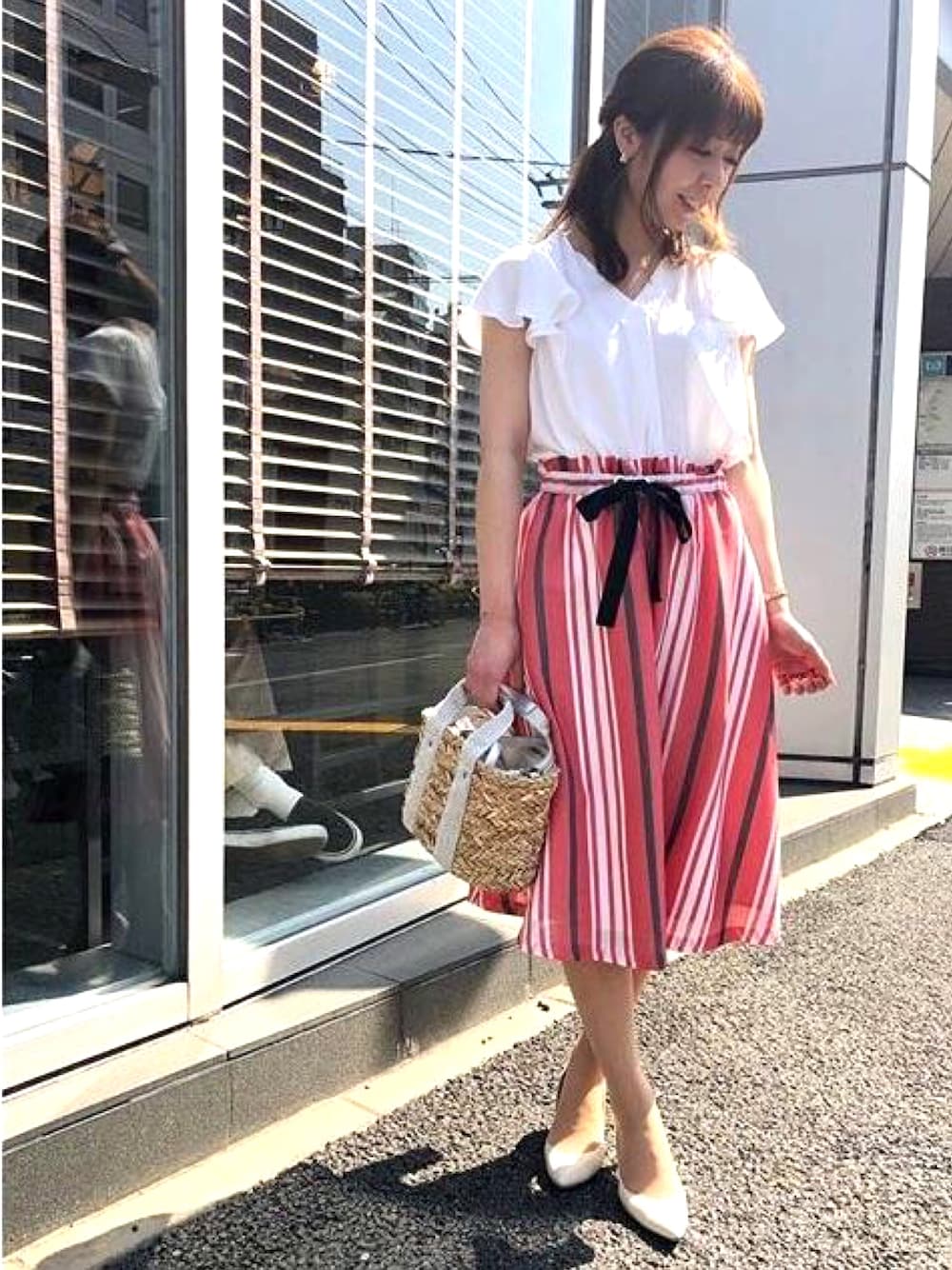 赤ストライプでマンネリ解消! 初夏の晴れた日のコーデ♡