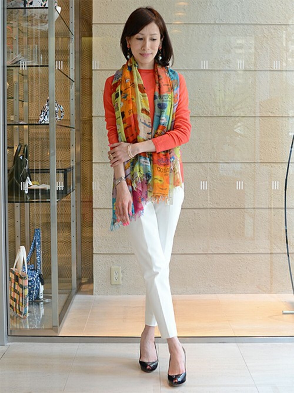 ビームスハウス 丸の内 スタッフ 綺麗なオレンジ色のニットはクルチアーニのもの。シンプルなアイテムだからこそ素材や仕立ての良さが活きてきます。