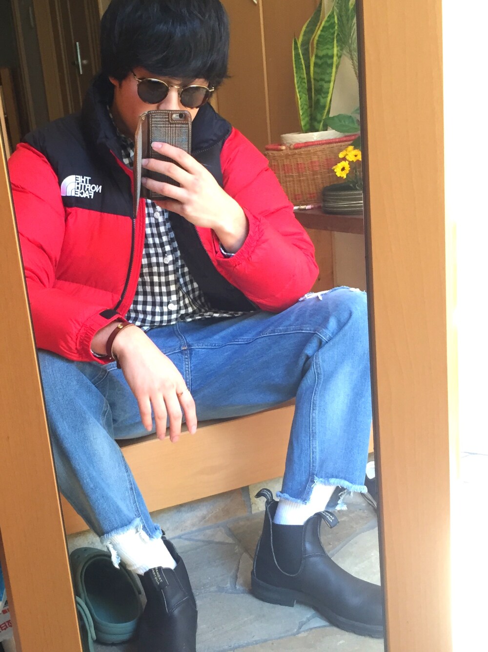 黒と赤を基にコーディネートしました! ボトムスに淡色のカットオフのダメージジーンズをもってくることでアメカジ感を出しました! 赤のヌプシと淡い色合いのダメージジーンズでは、少しワイルドになりすぎるので可愛さや爽やかさをイメージして、maillotのギンガムチェックシャツを中に合わせました! maillotのシャツは襟や裾、ボタンなど細部までこだわっていてオススメです! 着るたびに馴染みます。 ボトムスはGUのW's 17ssのものです。 全体的にワークスタイルのような男らしさを出しつつもどこか爽やかさが残るスタイリングです!