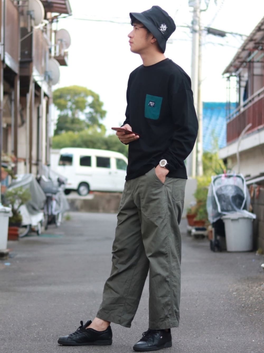 ブラックメインのワンポイントにグリーン🌲 topsはWEST CLIMB✖️Mountain ManiaのコラボしたロンTです🥳 フロントポケットがワンポイントになって今の時期一枚でも着れますし、バックプリントは温度によってカラーが変わるので斬新でお気に入りです😆 Instagramもやってます‼️ @egaaaa.182