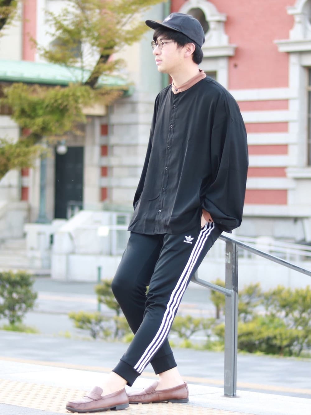ブラック✖︎ブラウン 今回のコーデはスポーツMIXで組み合わせました!! KUUUPY 袖口と襟のブラウン色の配色、袖の溜まり感が最高すぎ🙌 shirt L pants L shoes 28㎝