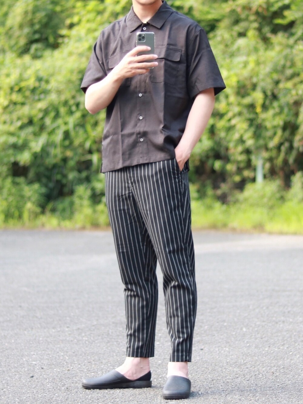ブラックコーデ ブラック一色でまとめました! その中にストライプなどワンポイント付け加えると、個性的になります😋 shirt L pants L sandal 28.5㎝ Instagram→@egaaaa.182