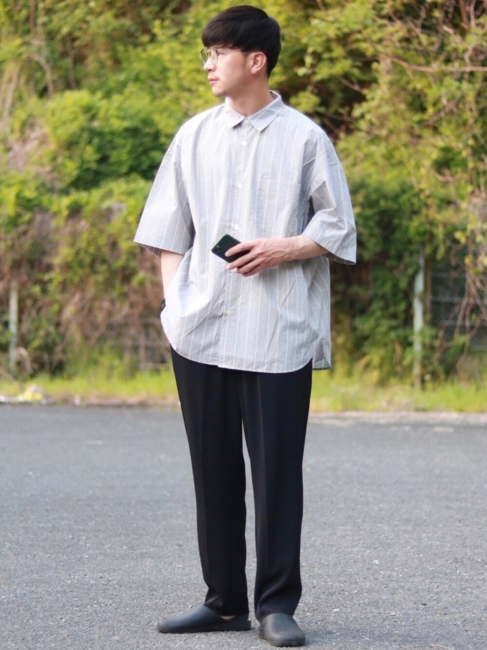 ○ブロードオーバーサイズシャツ 初めからオーバーサイズでカジュアルになりすぎない程よい大きさです!! シワになりにくい為、お手入れも簡単です🙆♂️ shirt XL pants XL sandal 28.5㎝ Instagram→@egaaaa.182