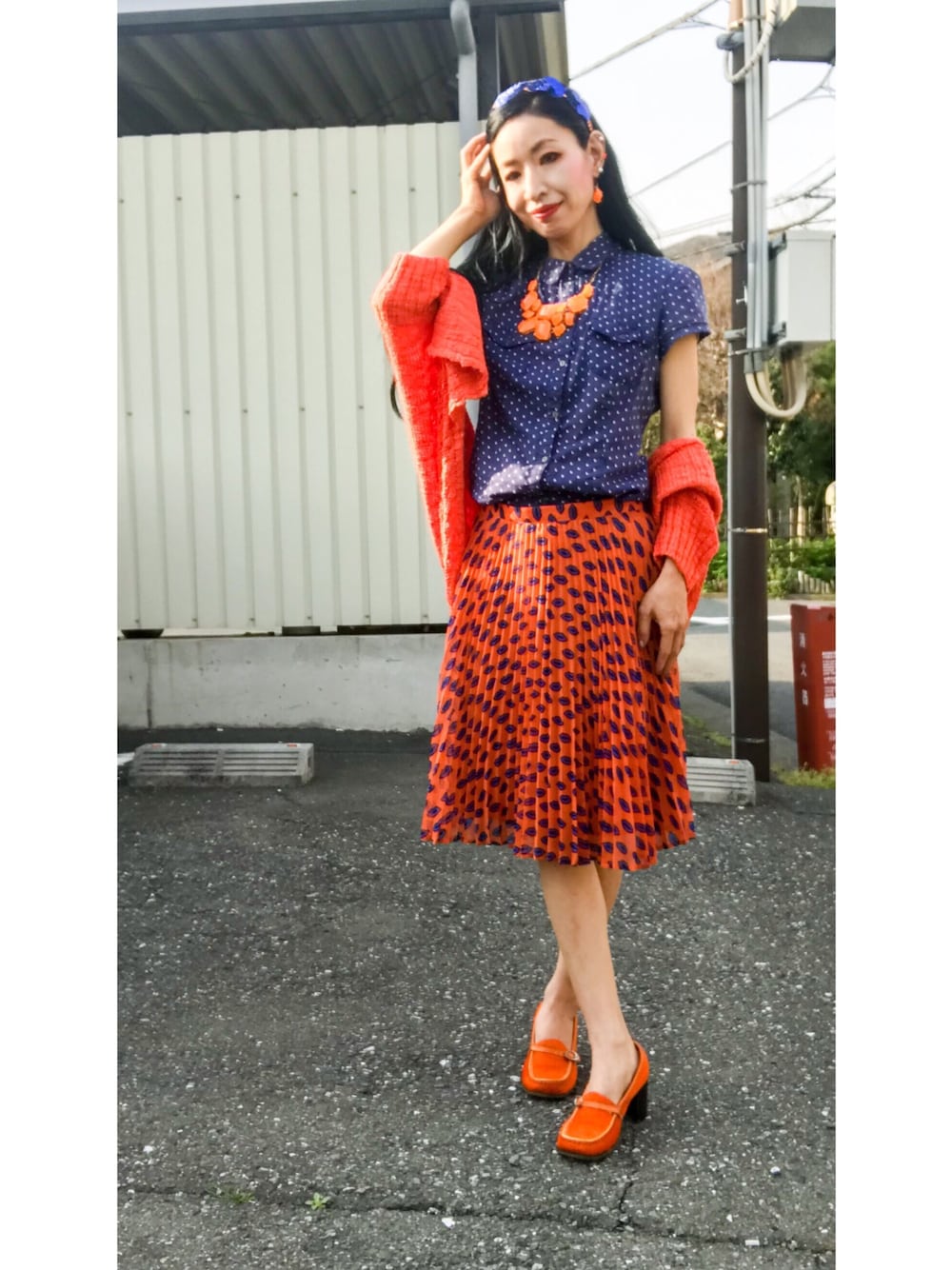 オレンジ中心に、にネイビーを差し色にしたコーデ。 リップ柄のプリーツスカートがお気に入り♡