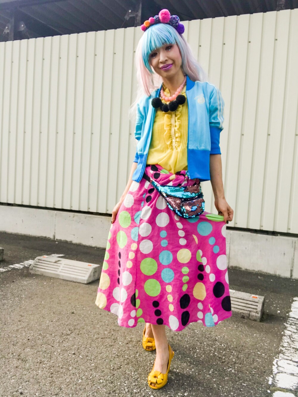 POP POP POP ! and PON PON PON ! adidasのショートトラックジャケットと、スパンコールのウエストポーチがポイント。