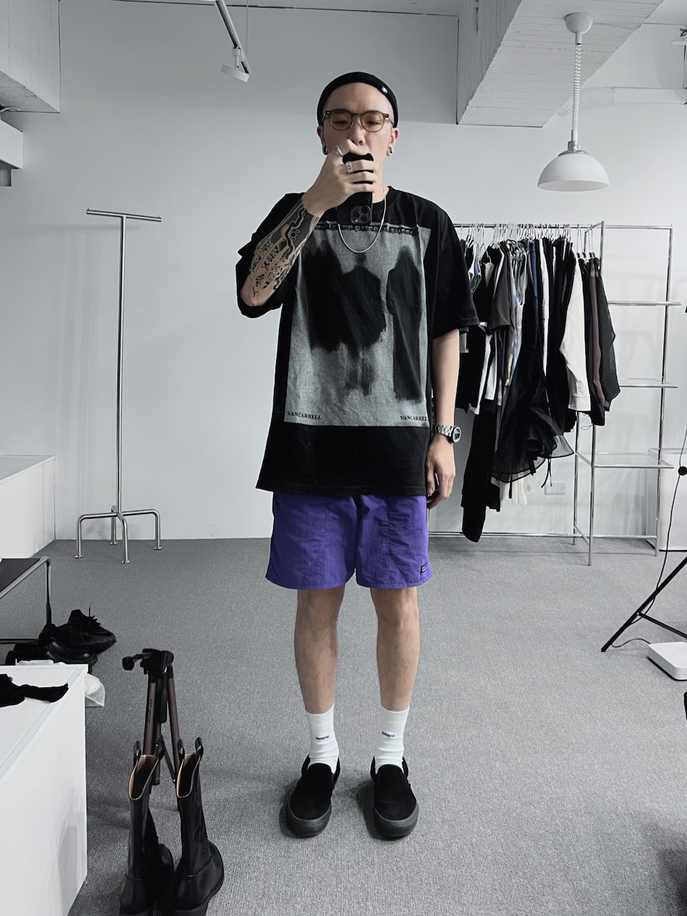 JiBaShuenのスニーカー「VANS ヴァンズ SKATE SLIP-ON スケートスリッポン VN0A5FCABKA BLACK/BLACK」を使ったコーディネート