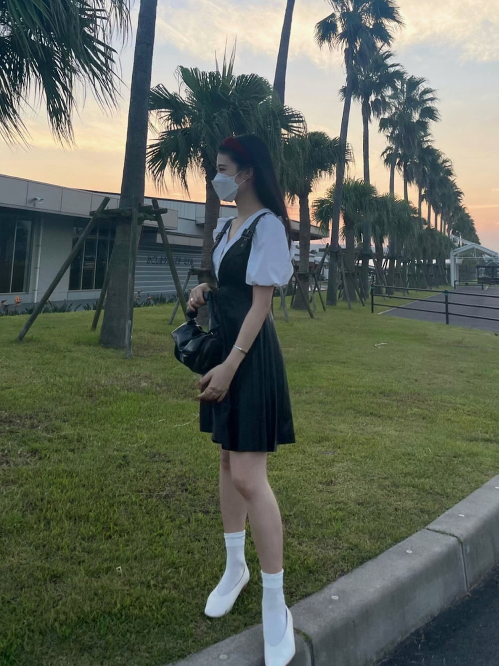 ブラック系のバッグ、ブラック系のジャンパースカート、ホワイト系のシャツ/ブラウスを着用したレディースの秋コーディネートの1枚目の写真