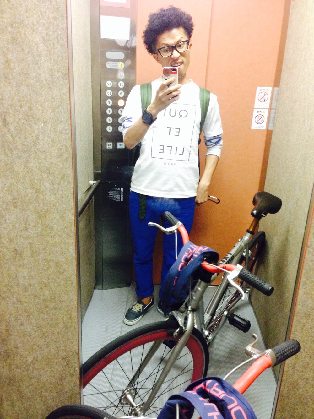 ブルー系のその他パンツ、ブルー系のスニーカー、グリーン系のバックパック/リュックを着用したメンズの春コーディネートの1枚目の写真