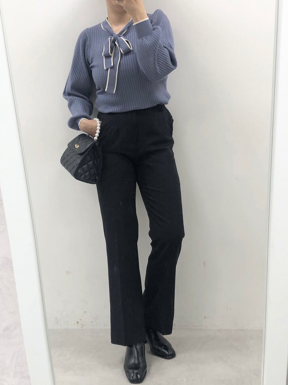 ◎身長162センチ ◎骨格ストレート/イエベ春 ◎足のサイズ24.5〜25㎝/Lサイズ 【トップス】フリーサイズ リブニットでとにかく着やすい&着心地がいいです! スッキリに見えますが、タイトすぎないのが◎ ボウタイのパイピングがアクセントになるので、シンプルなボトムスでスタイリングが決まります! 会社にも着ていけるキチンと感もあり、オフの日にデニムで気楽に着れる感もあり、 多様な場面で使えます! ブルーはくすみカラーで落ち着いた雰囲気が良いです! 【パンツ】ZOZO限定アイテム
