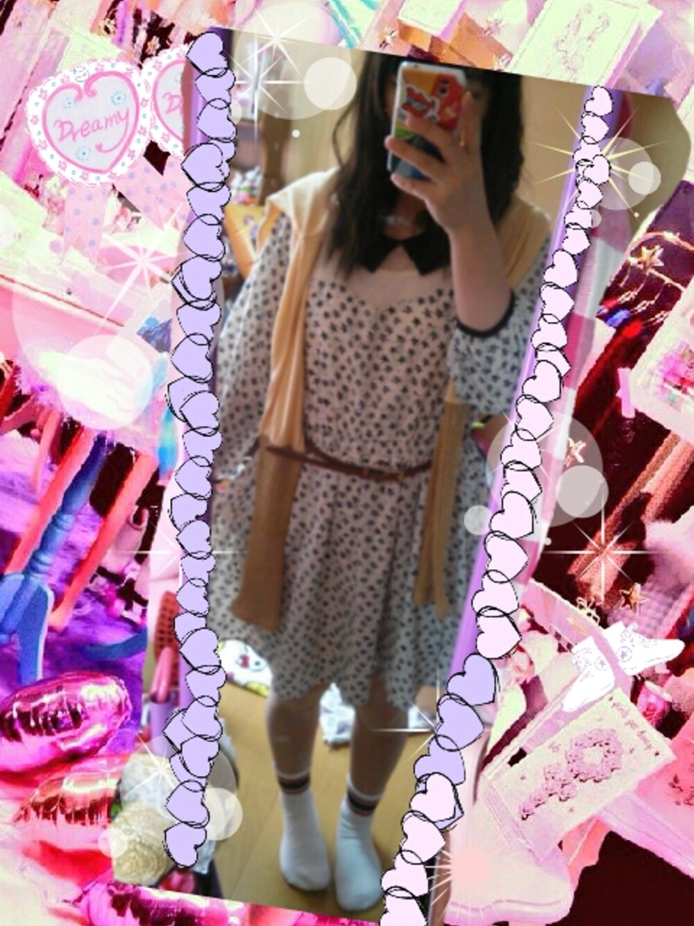 星柄ワンピースにTシャツを羽織ったところです♡ そしてGUの細ベルトをすることによって メリハリがなっているところ❁