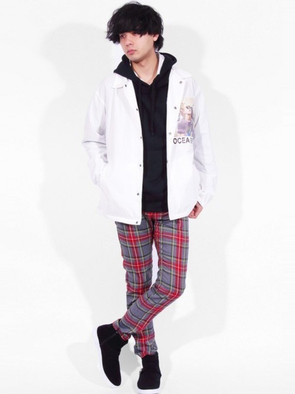 こんにちは! いつも『いいね』ありがとうございます🙇 インパクトあるフォトプリントを胸部とバックに施したコーチジャケットを使用したストリートスタイル🕺 ブラック×ホワイトのコーディネートに遊び心あるチェックのスキニーパンツを合わせた カラーバランスの取れたコーディネートです✌️ 是非参考にしてみてくださいね💁♀️ ★よかったら、いいね・フォローお願いします★