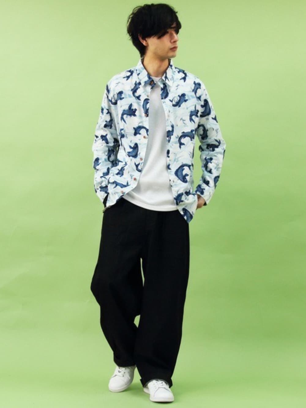 こんにちは! いつも『いいね』ありがとうございます!! 今日はこれからの季節にピッタリなラフコーデです♪ 青と白を基調とした、柄物でありながらも 爽やかな印象なシャツです!! 黒のワイドパンツとの相性も良いです!! ★よかったら、いいね・フォローお願いします★