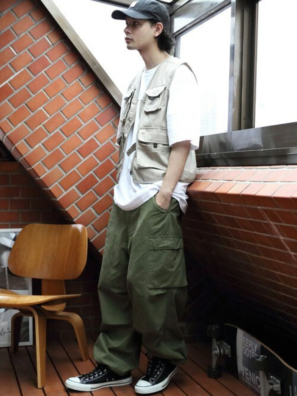シンプルなビッグシルエットTシャツや カットソーに重ね着するだけでおしゃれが際立つフィッシングベスト🎣💚 軽量なポリエステルコットン生地でラフにサッと羽織ることができます🙏 メンズだけでなく、レディース、ペアでも着られるユニセックスデザインです◎ ■VEST フィッシングベスト ■TOPS Carhartt ロゴ半袖Tシャツ ■BOTTOMS スノーワイドカーゴパンツ ■SHOESE converse ◇他のカラーのコーデもzozotownに載せているので 良かったらcheckしてみて下さい♪◇ ■いいね・フォロー・コメントお願いします■