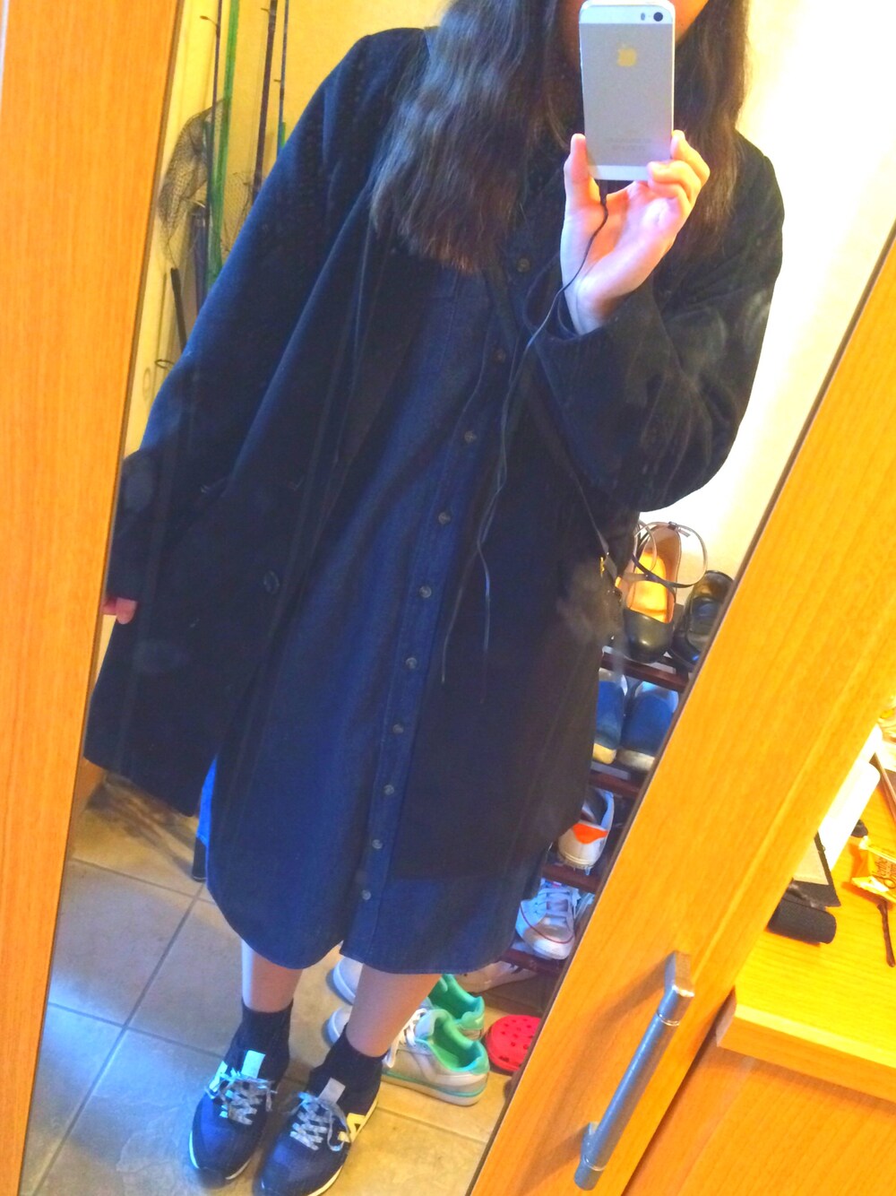 まだ少し肌寒いのでデニムシャツワンピースの上にチェスターコートを着て防寒対策しました☺︎ ワンピース久しぶりに着たから下がスースーする😅