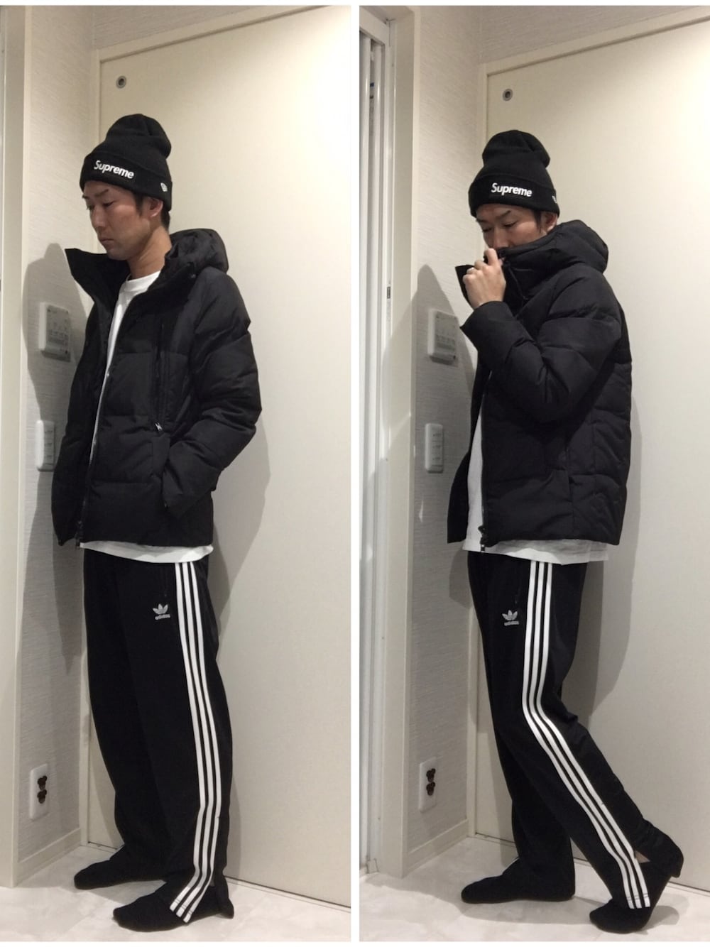 靴ありバージョンは小窓にあり😎 adidasのパンツが主役のモノトーンストリート✨ サイドジップ開けてスニーカーにかぶせると、また違うシルエットになってよき♥️