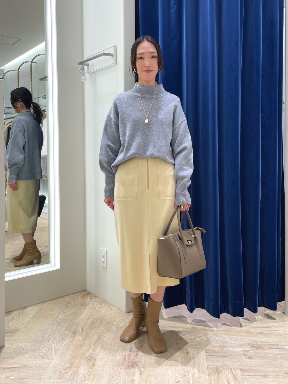 イエローとグレーで柔らかい印象に。 淡い色味でまとめるのがポイントです! ニットは柔らかい素材感◎ チクチク感がなく、オーバーすぎず コンパクトさがあるのが ソフィーのハイネックニットの特徴です。 脇にスリットが入っていて、 インしてもごろつきにくいです。 タイトスカートは、 ストレッチが全体に効いていて更に ウエストの内側にゴムが入っているので、 とても履き心地がいいです👍 肉厚でウールタッチな素材感で温かいです。 ぜひチェックしてみてください!
