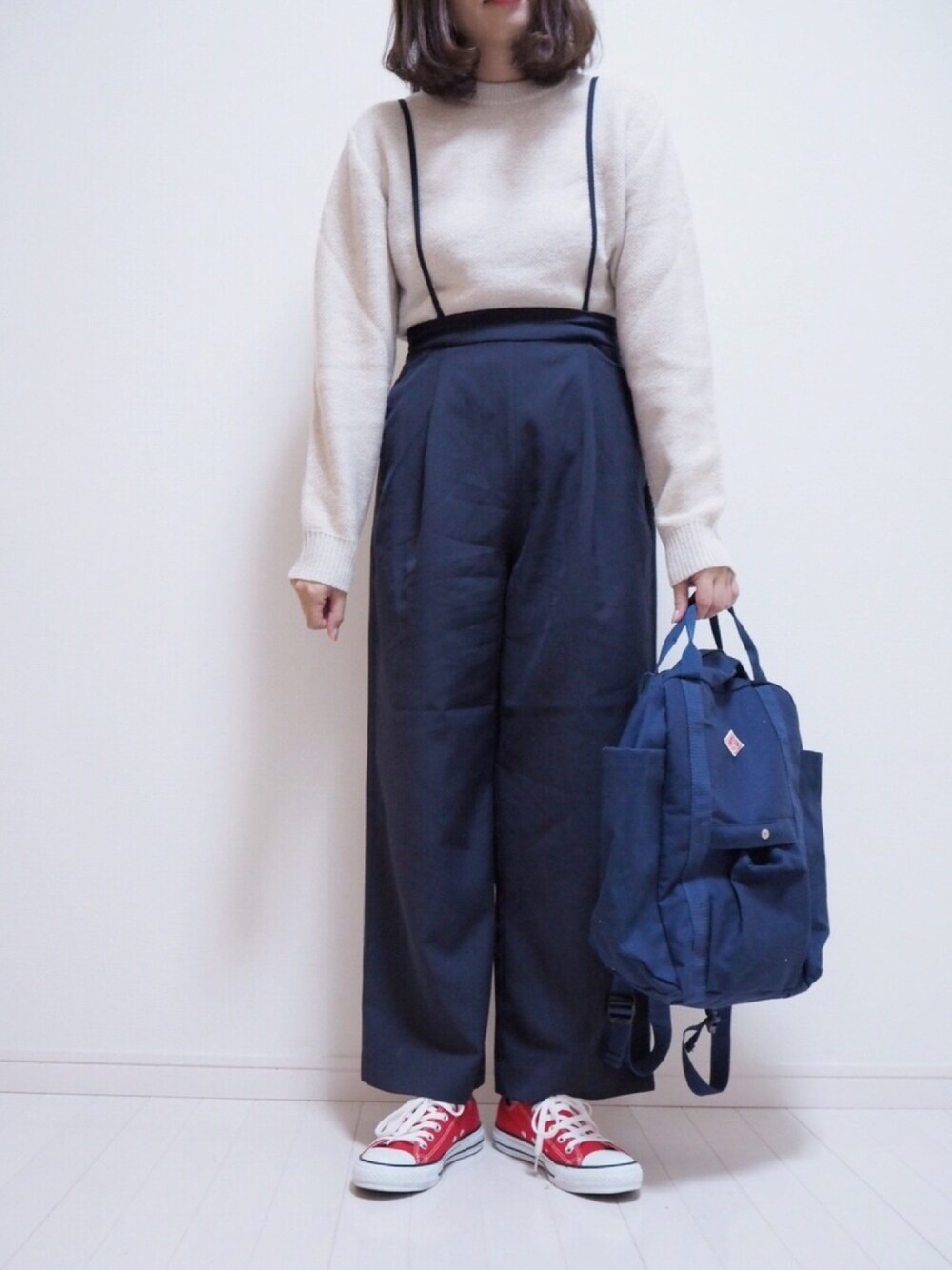 URBAN RESEARCH DOORSのサスペンダーパンツ可愛い♡ カジュアルに合わせました⑅◡̈* 少しハイウエストにして着ています♡ トップスは昨日購入したばかりのUNIQLO Uのニット◡̈♥︎ instagram→eiko_wear08