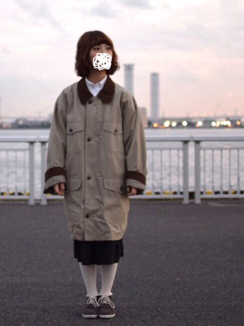 水族館に行ってから夕焼けが綺麗なところでパシャり📷✨ 前回の写真にあるように、バブアーを着たらまた着たくなってきてしまって、バブアー風のお父さんの古着をチョイス。重たい感じのシルエットが渋い雰囲気でよいです◌◎