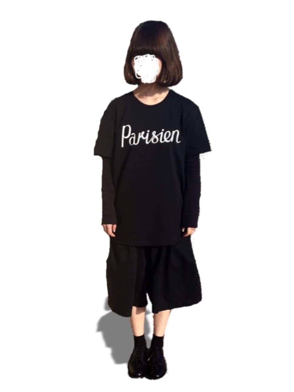すっかり撮り忘れていて、急いで撮ってもらいました!笑 メゾンキツネのTシャツにスカートのようなワイドパンツと、全身黒ずくめでモードスタイルに。。
