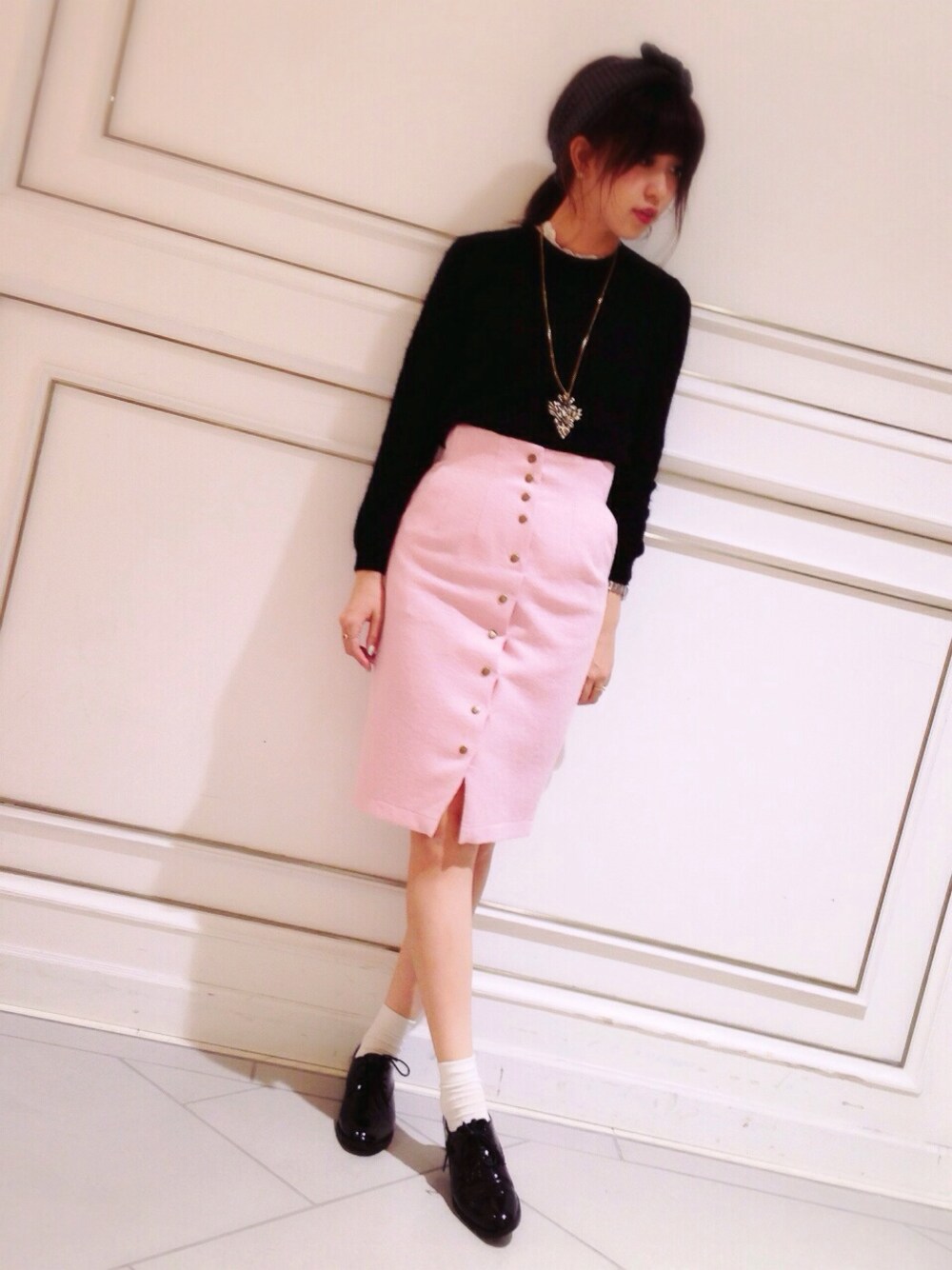 ポップなカラーのウールタイトSK blackアイテムで大人にブラッシュアップ ボタンの配列がなんて愛しいんだ。 今日は寒い!ニット♥︎